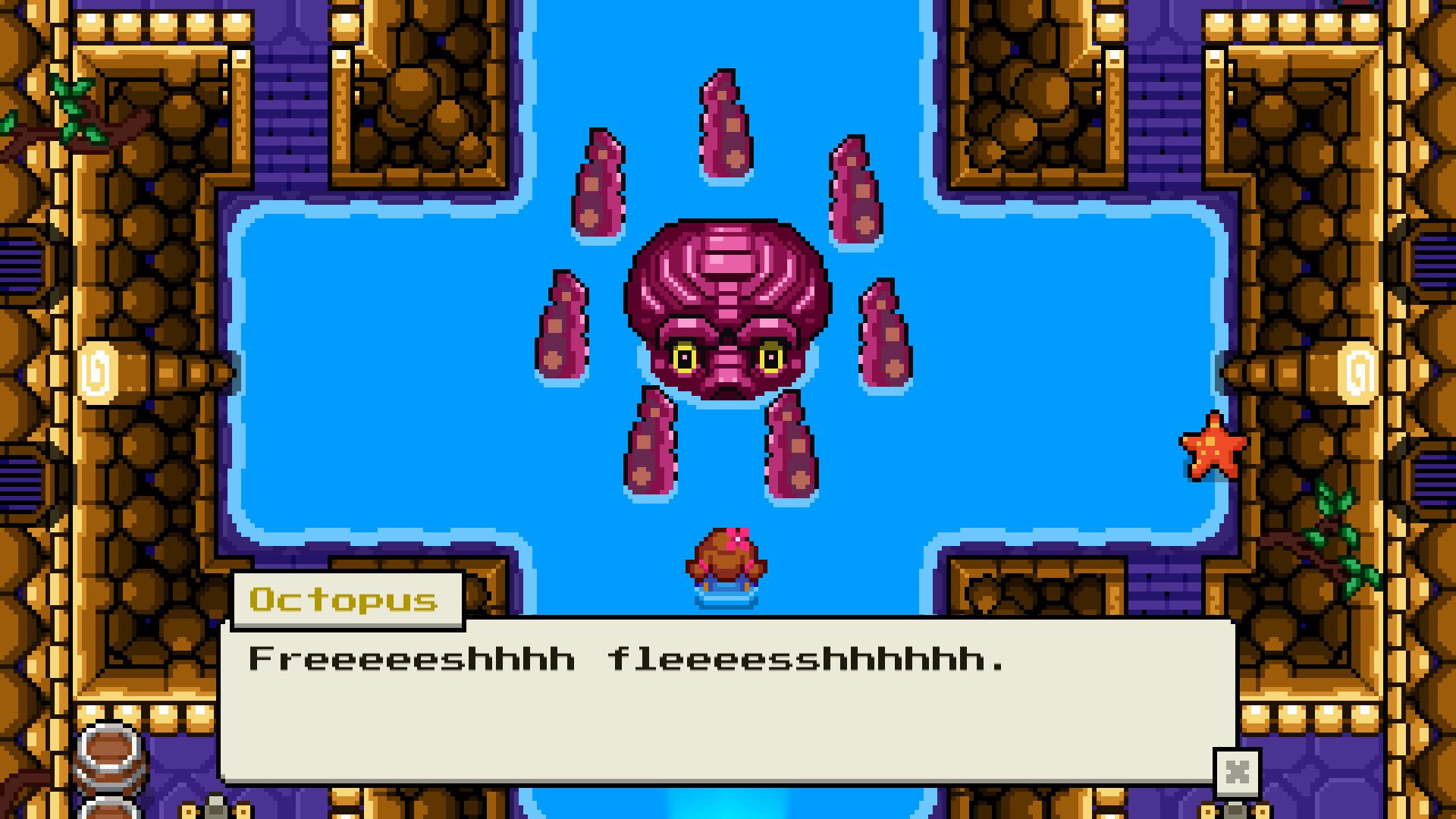 One of the few gripes I had with Blossom Tales has unfortunately been carried over to the sequel; namely, the unimaginative NPC interaction. If you’re like me, it’s great to discover a new town and what do you do first? You talk to people, right! You can learn secrets and tidbits about the game world in the process. However in Blossom Tales 2: The Minotaur Prince, all of the town NPCs have 3 or 4 generic phrases that seem to be randomly generated when you speak to them, rather than them all having bespoke dialogue. I’m compelled to compare this to arguably Castle Pixel’s biggest challenger to their 2D Zelda throne, Ocean’s Heart, which had unique dialogue for every NPC and it just brought a whole load of depth to the experience.