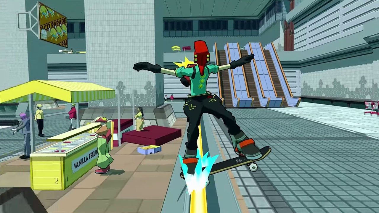 Bomb Rush Cyberfunk has a trick system that is a blend of Jet Set Radio and the Tony Hawk's Pro Skater series, albeit very simplified. You initiate tricks by hitting one of the face buttons, instead of a combination of two like Tony Hawk's Pro Skater, and you can chain these as much as you like so long as you are either grinding, manualing or in the air. Unlike the Pro Skater series, your point multiplier doesn't increase with each trick you perform. Instead, it increases whenever you lean into a turn while grinding or wallriding on a surface. This change leads to situations where you need to get a high score (like the turf battles that progress the plot)