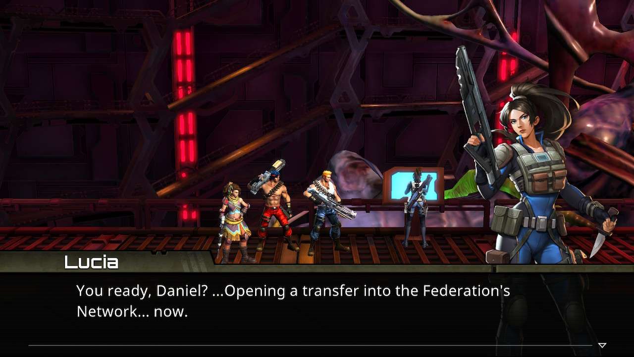 There are three game modes available to play in Contra: Operation Galuga. The first is the story mode, which allows you to play through all eight stages solo or with a second player following the story, which, by the way, is fully voice acted with a plethora of new characters that unlock slowly over time. Each character has their own unique abilities, such as Bill and Lance both being able to double jump; Lucia can use her grapple gun to launch upward; and Ariana can use her slide to avoid enemy bullets.
