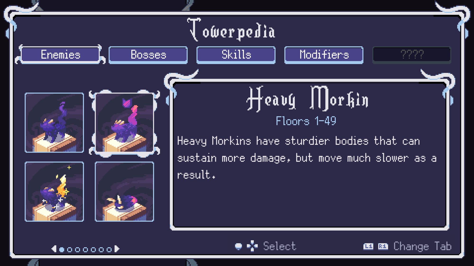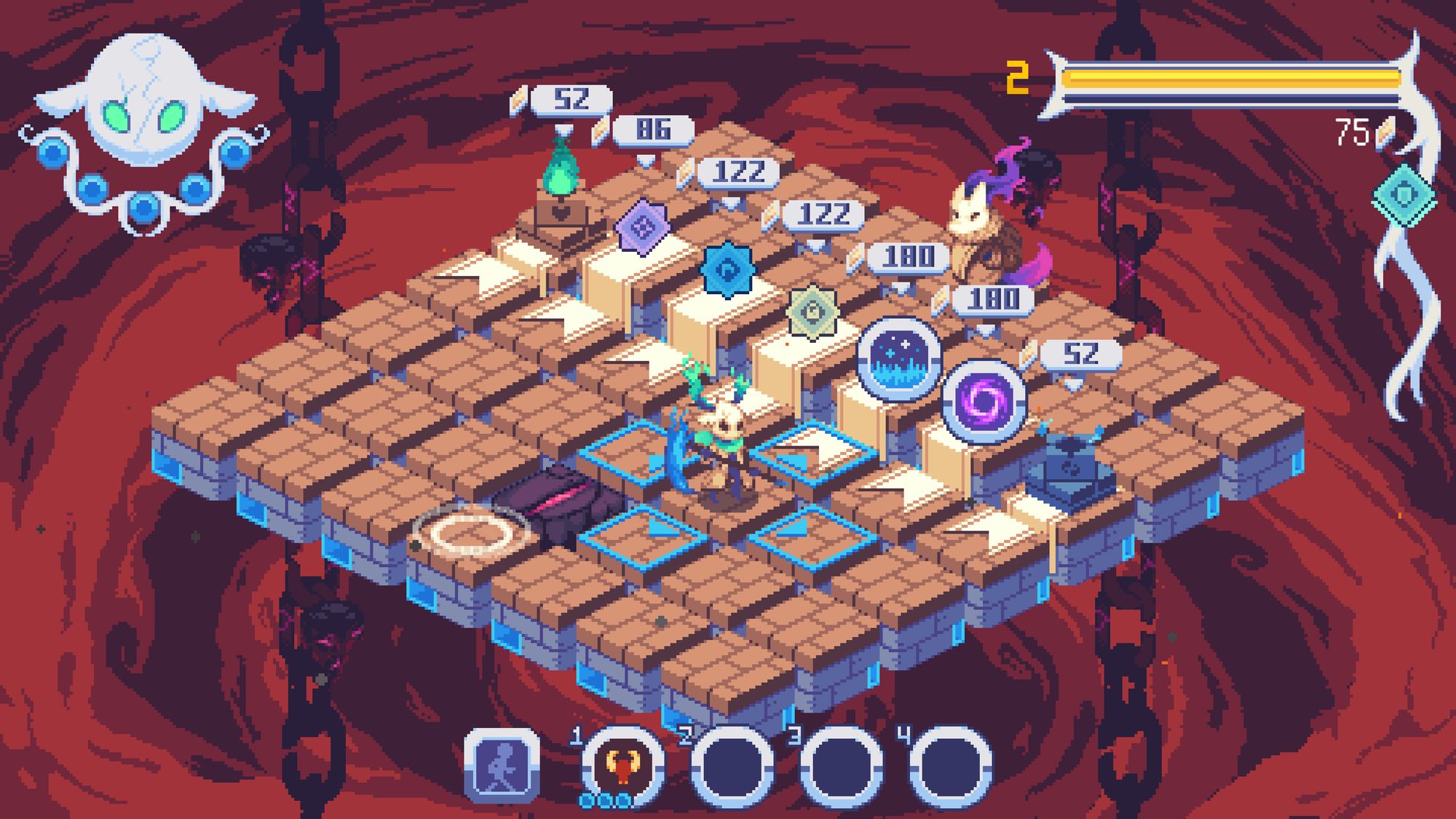 On the matter of skills, they can be leveled up and mastered, and the player can then equip a single one at the start of a new run, so long as they have mastered them. The issue arrives with the mastery system: it takes an extremely long time to master a skill and make it available. With each use of a skill, it levels up a little and utilising skills takes charges which you acquire by moving around with your precious turns; many times, you will be better served simply whacking enemies with your scythe rather than using the often expensive and hard to use skills. I have found that the best way to level up skills isn’t to organically utilise them throughout your run as you climb the tower but instead, to leave one harmless enemy alive and run laps around it to build charges and utilise the skill repeatedly on nothing at all until it levels up. It was either that or risk dying and losing both the run and my shot at having something new to try for the next one.