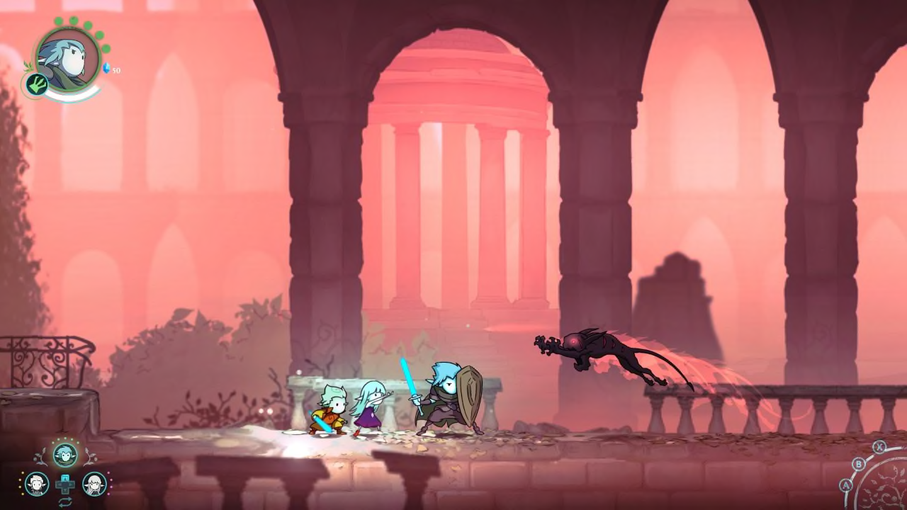 Once Adara and Raydel join Greak in your party, you’ll travel around in a group and the team must work together to progress. You can freely alternate control between all three characters and you can either choose to advance as a group if close enough together (by holding down ZL) or individually. This leads to a number of cleverly thought-out puzzles whereby you need to position everyone in the right place so as to compress a number of switches simultaneously or deflect light beams (for example), allowing you to progress. The puzzles are a highlight of the gameplay and each one is a little brain-teaser in itself.