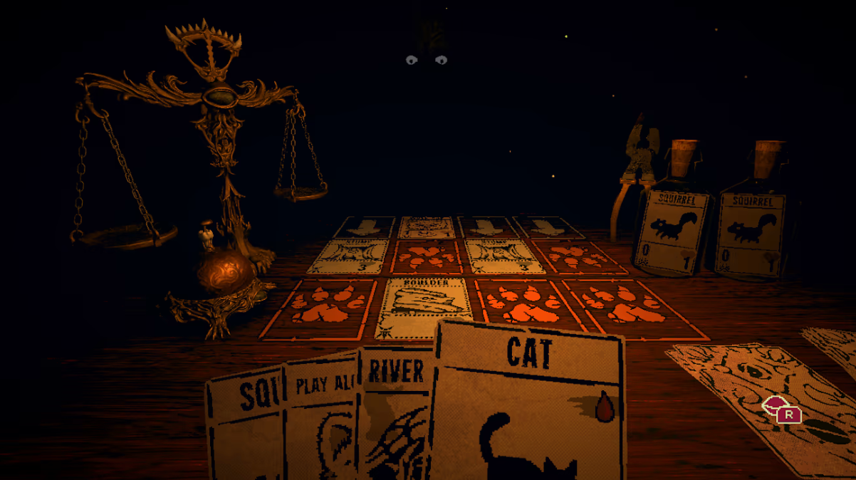 As for the escape room aspect of Inscryption’s gameplay, it is masterfully woven into the narrative and the core card game mechanics. You may be trapped in a cabin with a killer but your captor is confident enough that you can’t escape, so he lets you get up from the table and walk around. Strewn throughout Leshy’s cabin are puzzles that, when solved, will either reward you with new cards that are permanently added to the deck, hints on how to escape, bonus abilities for your cards or ways to cheat, like a pair of pliers to pull your teeth out and add them to Leshy’s scale since he never made a rule stating that you can’t do that.