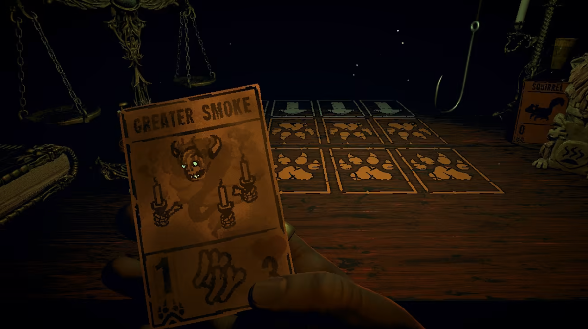 You wake up in a daze while your head throbs in pain. You try to inspect the source of the pain only to find that your arms are tied down. As your eyes begin to clear and adjust, you notice you are at a small table in the middle of a dark room while a dim lantern faintly illuminates a figure across from you. To your left, you see a set of scales, to your right, a pair of pliers and a small knife. Noticing that you’re awake, the figure slowly reveals his toothy grin and stares at you with malice and excitement. The figure slowly places something on the table without breaking eye contact with you, his maniacal grin changing shape to form words. You then hear in a deep croaky voice “I activate Pot of Greed, it allows me to draw two cards from my deck!” As absurd as this story sounds it is the main concept of Inscryption.