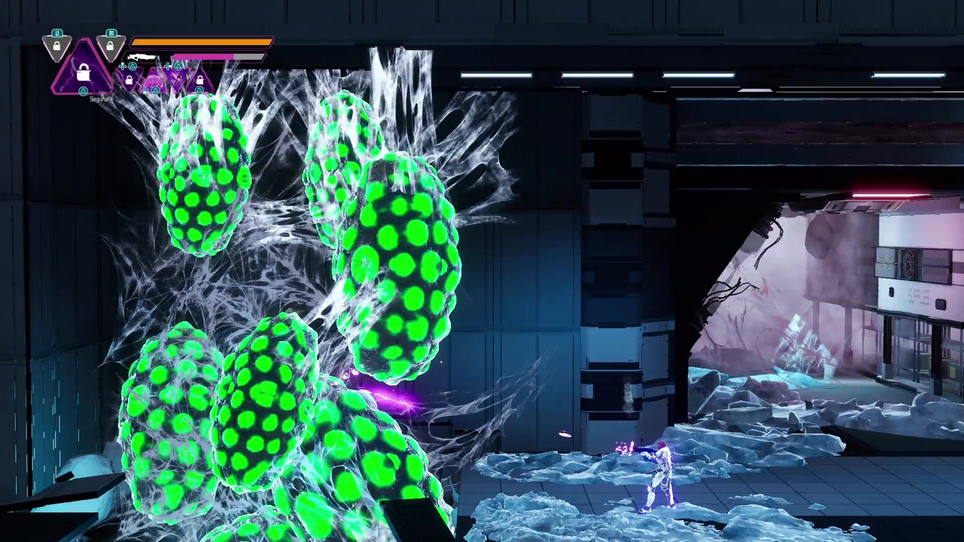 Despite being a 2D metroidvania MARS 2120 has some really awesome 3D effects, being visually very similar to its main inspiration Metroid Dread. For example, enemies crawl into combat onto the 2D plane from the 3D background, and the game begins with a pretty epic sequence where you’re outrunning a rock avalanche over a surface that is crumbling beneath your feet. The story elements are sadly pretty sparse, but where MARS 2120 lacks in traditional storytelling, it more than makes up for it in environmental storytelling, making no mistake about the peril that your character, Sergeant Anna "Thirteen" Charlotte, finds herself in on planet Mars.
