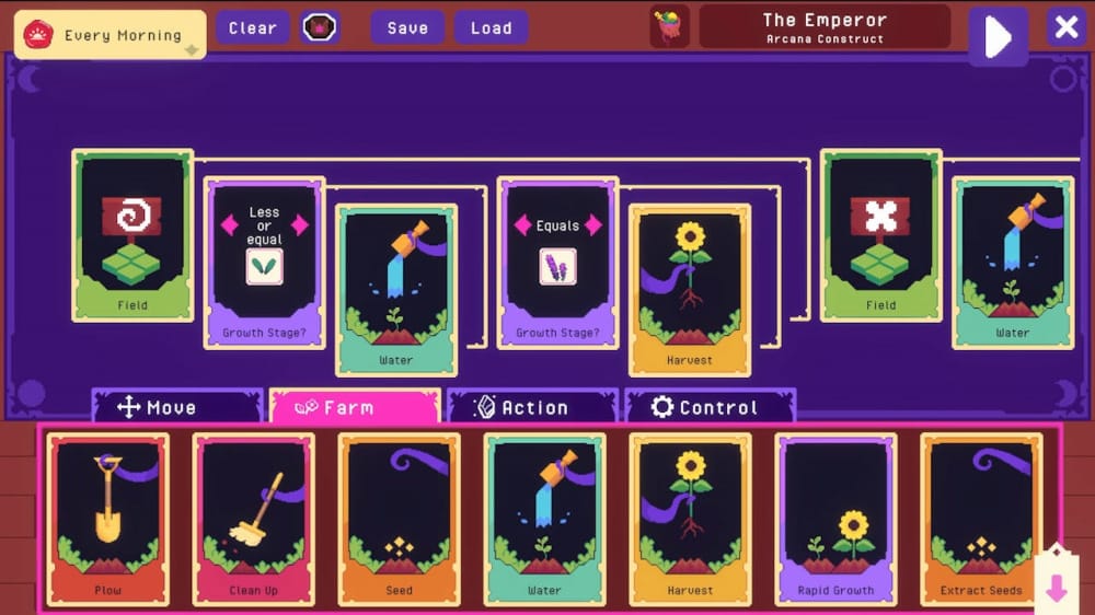 Firstly, farming. For vague magical reasons, you cannot farm crops and flowers with your hands in this world. This means you need to use plant-pot-shaped magic automatons to do your work for you, and your job as the new magic user in town is to ‘enchant’ them. ‘Enchanting’ is actually programming; using command cards (‘harvest’, ‘water’, etc.), your constructs will do all the legwork—you just need to programme them, activate them, and collect the results. What starts out fairly basic soon gets into more elaborate areas as you unlock options like loops, conditions and timers, and before you know it, you’ll have a fully automated farm and mine you won’t have to touch. It's a fun and new way of handling farming gameplay, letting you spend your time elsewhere. If you are logic/programming-minded, you’ll have plenty to play with here.