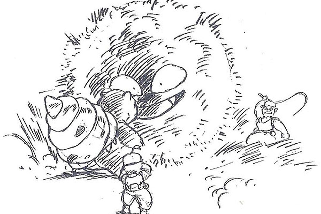 It’s difficult to say for sure, but this piece may have been an early concept design for Celadon City due to the three-storey mart on the left side of the sketch. The drawing also shows someone riding a bicycle, a staple in the Pokémon series. Ever since the release of Pocket Monsters Red and Pocket Monsters Green, players have been able to encounter trainers in cities with their Pokémon outside of their Poké Balls. Clearly, this was something very important to Tajiri as it reflected the idea of living in harmony with Pokémon.