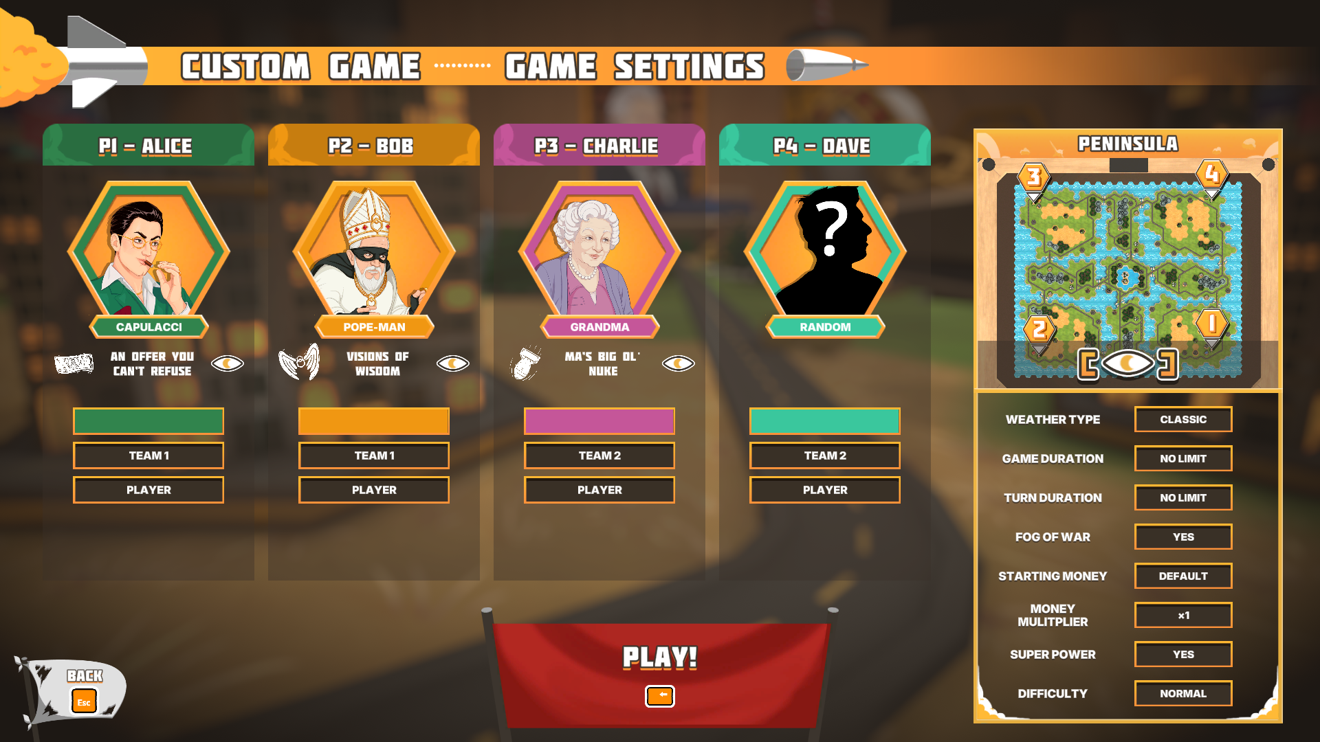 As you can perhaps tell from the description and artwork, Super World War is by design a very silly game. The writing and characters lean into the irreverent and stupid with an occasional satirical edge. Fortunately it commits to the bit and generally succeeds in being funny. To give you an idea, the broad caricatures of the commanders you will control include King Capitulet – a cowardly, stupid, becrowned monarch – and Pope Man – a pope-themed superhero (or possibly a superhero-themed pope; it's not especially clear). It is a very lighthearted approach to war, accentuated by the tabletop background of the battles, and all the better for it.