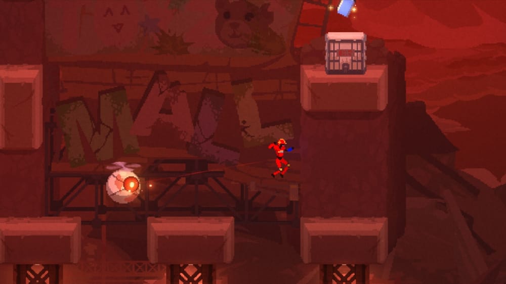 Turbo Kid also has a refreshingly mature element to it, which you scarcely see in these kinds of games. The enemies disintegrate into bloody body parts when you defeat them, there are themes of drug use, and there’s even some effing-and-jeffing. None of these things impress me particularly, but it certainly made the overall story experience more impactful and thought-provoking as a result. On the body parts… Another oft-neglected element that Outerminds has nailed is the melee combat. The Kid is armed with a machete, and it’s incredibly satisfying to gib enemies and crates along the way (if you don’t know what gibbing is, ask your parents!). Melee attacks in metroidvanias often get underused due to how ineffectual they are, but not here. The combat in general really feels punchy and satisfying.