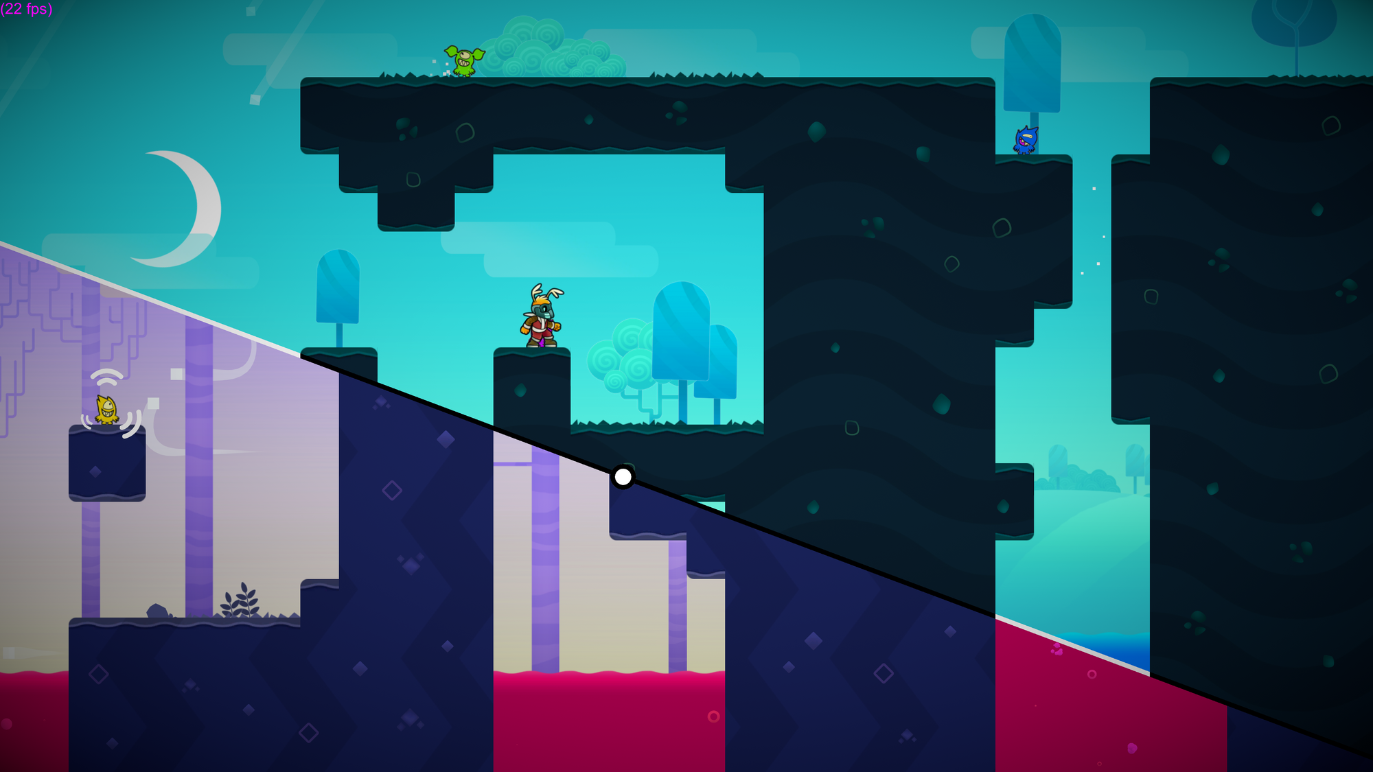 This hook also punishes you for careless play. If you are standing on a platform on one world that is in the middle of a column in the other and you move the rift too fast, you can be crushed; or if there is no platform on the other world and you move the rift, you will fall to your death. As the game progresses and enemies are introduced, handling the rift without a plan could end with enemies being released into your path, making completing a level difficult to impossible.