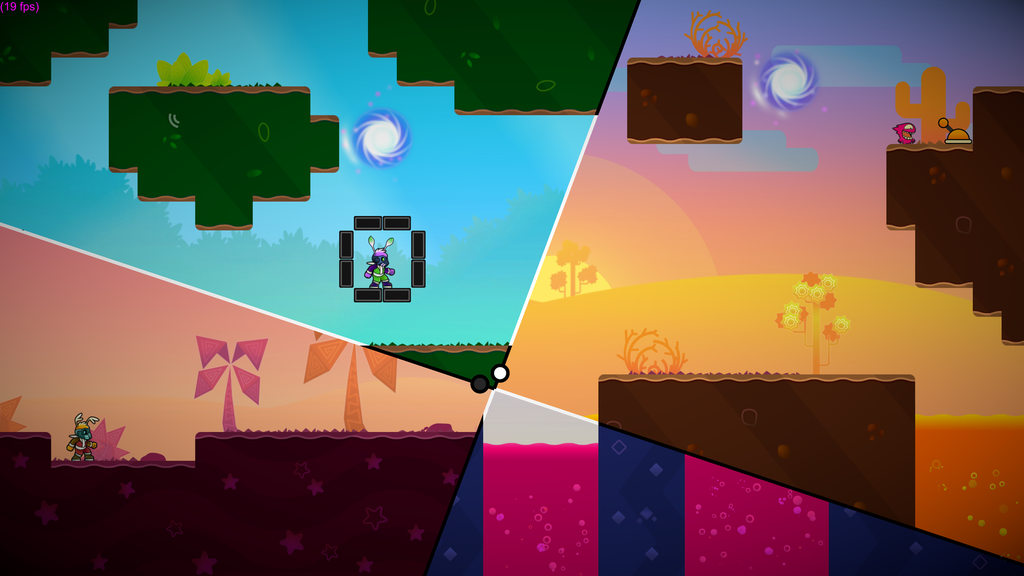 The ultimate goal of each level is to reach the opposite side of the screen. You are judged on three factors: First is the collection of tiny creatures that are spread throughout the level, second is how face you complete the level and third is how much you rotate the rift during the level. There are six worlds, each with ten levels to complete. Although score isn’t considered when unlocking a new level, completionists will find their work cut out for them with the stringent goals needed to obtain gold scores. The game also features a co-op multiplayer, with two characters and two rifts to control, which adds in a third world to navigate.
